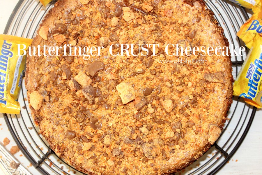 The Butterfinger crust is over the top, out of the park delicious, and totally makes this cheesecake a winner! I think I actually like the Butterfingers even better as a warm, gooey bed for that cheesecake than as the candy bars alone …haha!