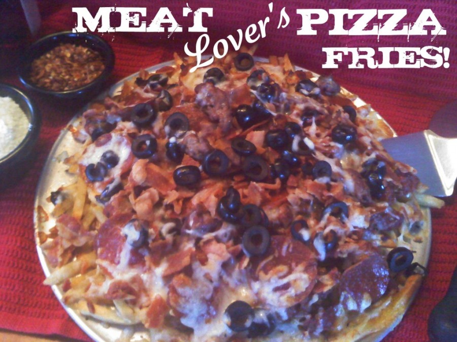An Entire Bag of Pre-Greased Frozen Fries + 1/2 lb Mozzarella Cheese + 1/2 lb of Ground Sausage in sauce + 1/4 lb of Marbled Steak Slices + 1/4 lb of Pepperoni + 12 oz Bacon + 1 Entire Head of Chopped Garlic + A Dusting of Parmesan, topped with Sliced Black Olives and baked until it’s golden & gooey (all the meats were pre-cooked!) Just pile it up and hoist it into the oven!