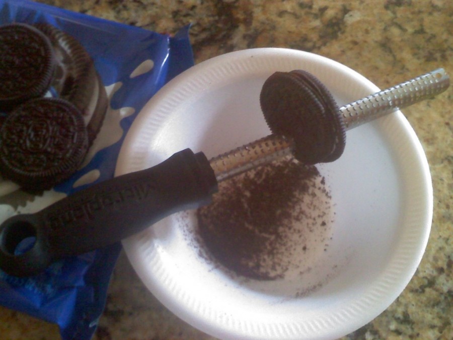 Make some Oreo Dust..just grated the Oreos into a bowl, and watch it fill up with the best dust ever! You can sprinkle this dust on anything that that needs improvement..lol! 🙂