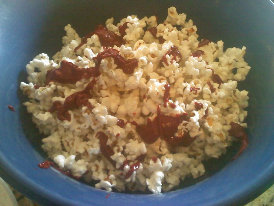 Pour the butter/cake batter over the popcorn, and with 2 forks toss it all together to combine..until your popcorn is a beautiful shade of Red Velvet! 🙂