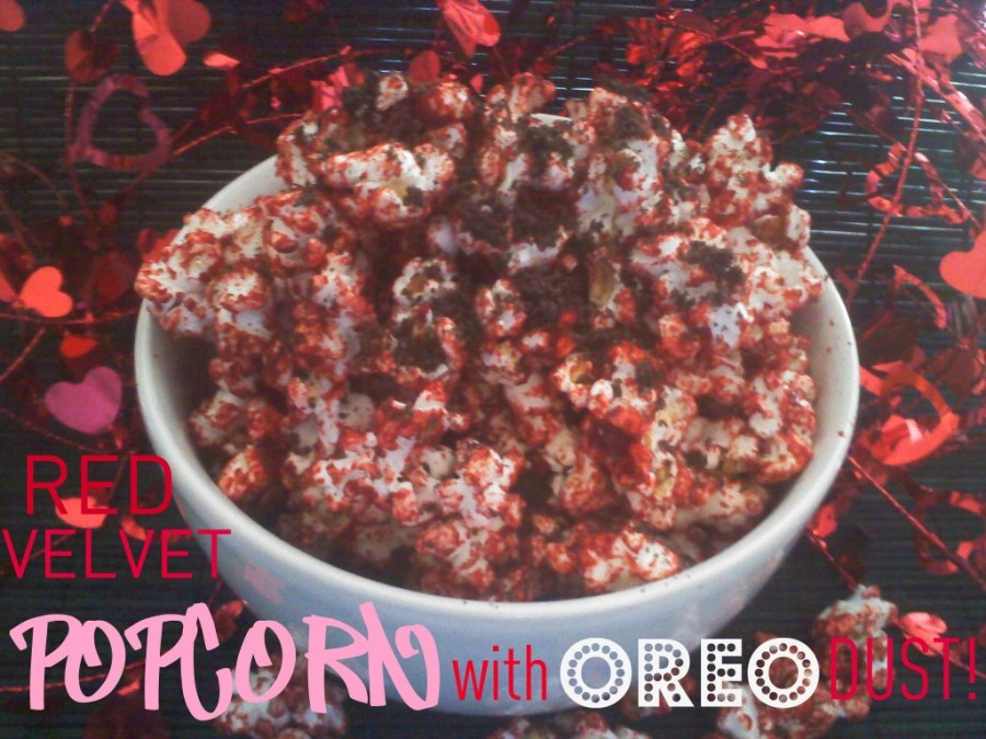 Even though this is popcorn, there’s no reason why it can’t be a little bit extra special, on this extra special day! And no matter what kind of day you’ve had, this treat won’t disappoint! So simple and yet so tasty, the Red Velvet cake mix kind of becomes one with the popcorn and then gets lightly encrusted with the Oreo dust! Whip up a batch to top off your day of love! And as a bonus, the pink-ish tint from the red velvet will give your lips a subtle romanitc glow! 🙂