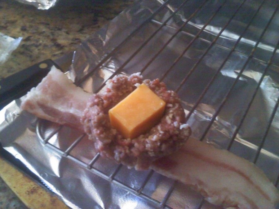 And then you committed the sin of all sins, and smacked cheese in the middle of the burgers and wrapped ’em in bacon. GET OUT!