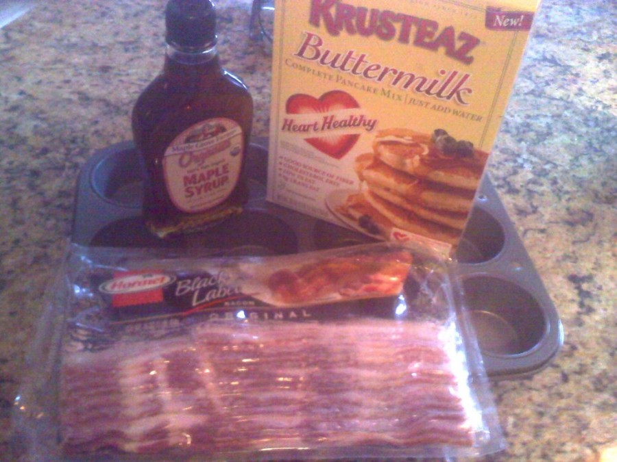 Sprinkle some crispy bacon into the syrup and pour the pancake batter on top of that..almost to the top!