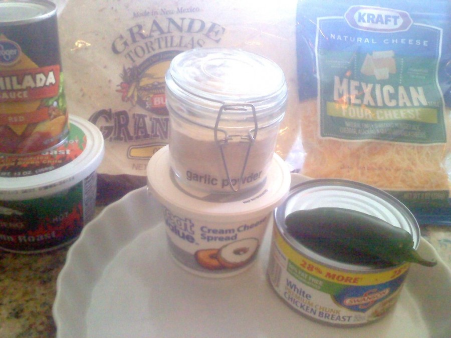 In a food processor (or with your muscles) combine the Cream Cheese, Jalapeno, Green Chile, Chicken, Garlic powder, S&P until well blended