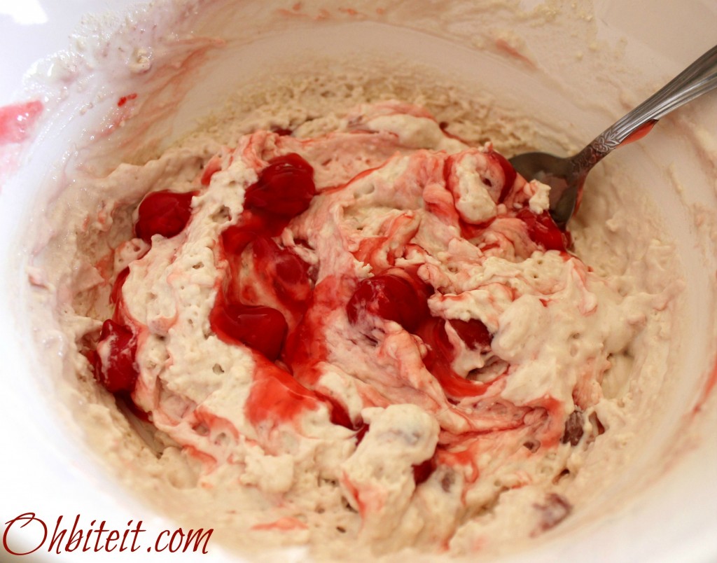 In a medium bowl mix everything together, and then gently swirl in the cherry pie filling..don’t over mix