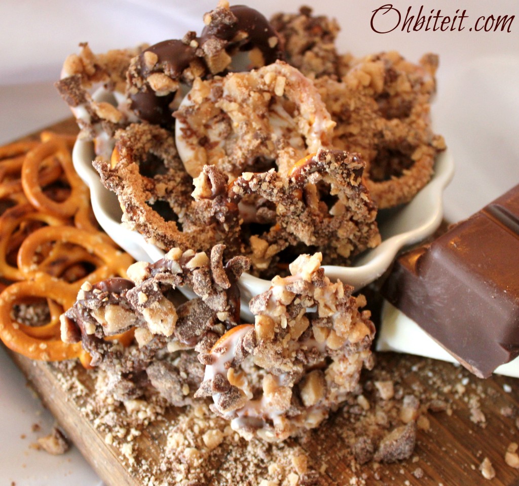 Dip one side of the mini Pretzel into the Chocolate, and dab each one into the Toffee Bits! *You can actually use any candy, nuts or bits that you like*