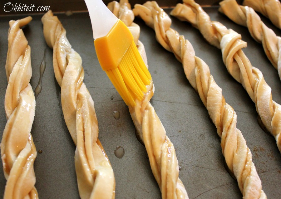 Lay each twisted straw onto a parchment lined baking sheet and brush them with the egg-wash (one beaten egg and a splash of water)….