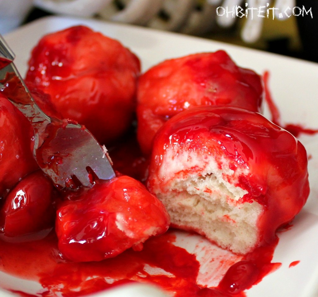 Place some of the dough balls into the simmering Pie Filling, drizzle on a few drops of the Red and Black Food Coloring (I used more Red than Black). The colors will take on their own bloody hue as they coagulate simmer! Cook them up in batches so they have room to puff up. ..