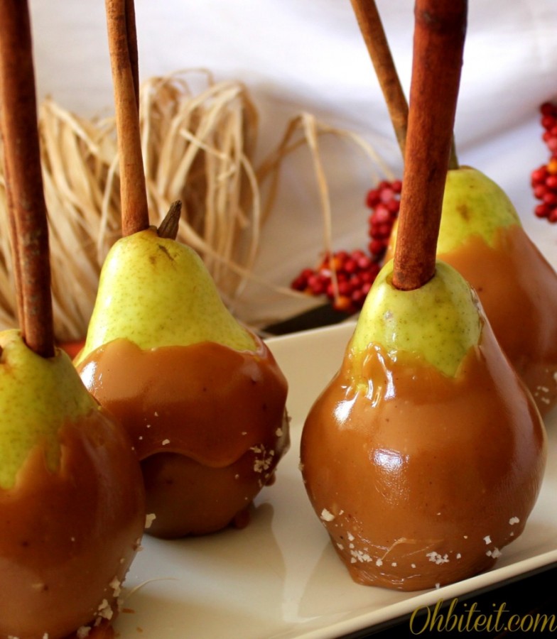 So what if Pear “got back”,..it’s what’s on the inside that counts right?! And the ample Pear has just as much to offer as its popular Ruby Red, well-proportioned cousin! So in honor of this second fiddle Fall fruit, I did the unthinkable! I traded in the popular Apple and decided to dip some cool, crisp Pears into hot & drippy Pumpkin Spiced Caramel instead! These Pears even have super cute Cinnamon Stick handles and some bling in the form of a salty Fleur De Sel sprinkling! Now it’s a tasty, beautiful Fall fruit worthy of love! 😉