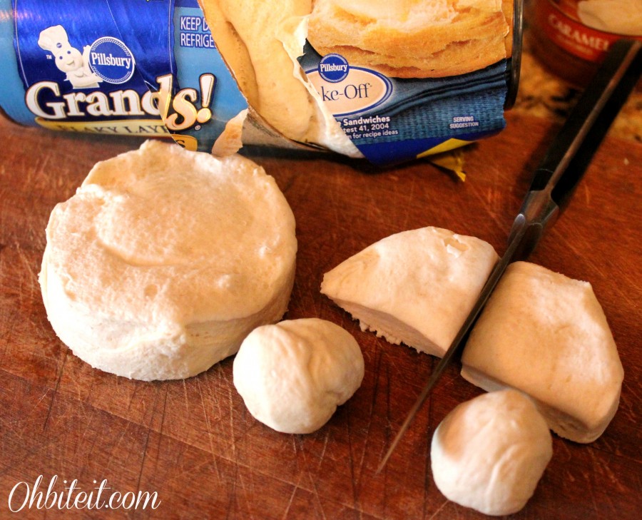 Cut each Biscuit into 4 pieces, and roll each piece into a ball, set aside…