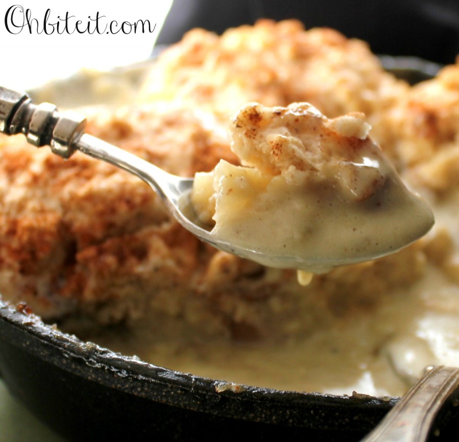 Remove the Skillet off of the heat and dollop some Biscuit batter on top of the Apples! Into the oven it goes..350 degrees for about 15-20 minutes, or until the Biscuits are golden and firm…