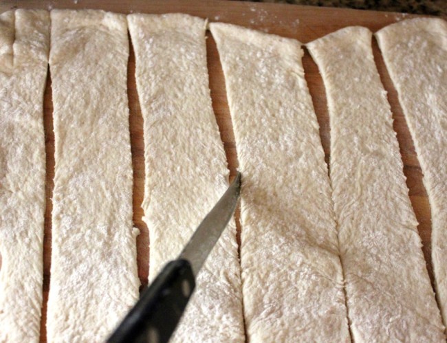 Cut approx. 1/8″ strips of the Cheese, making sure that there’s enough to cover almost the entire length of each strip of dough.