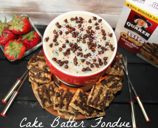 I decided to make up a delicious Cake Batter Fondue that cold be easily scooped up by chunks of Quaker Big Chewy Granola Bars. And when I say big, I mean BIG..like 60% bigger than the prior recipe~60% BIGGER! And bigger is totally better when it comes to these satisfying whole grain Quaker Chocolate Granola Bars. Not only are they BIG, but they’re filled with Quaker Oats, stuffed with real Chocolate Chips and covered in a decadent Chocolate Drizzle. Perfect for plunging into a thick, creamy and amazing Cake Batter Fondue!