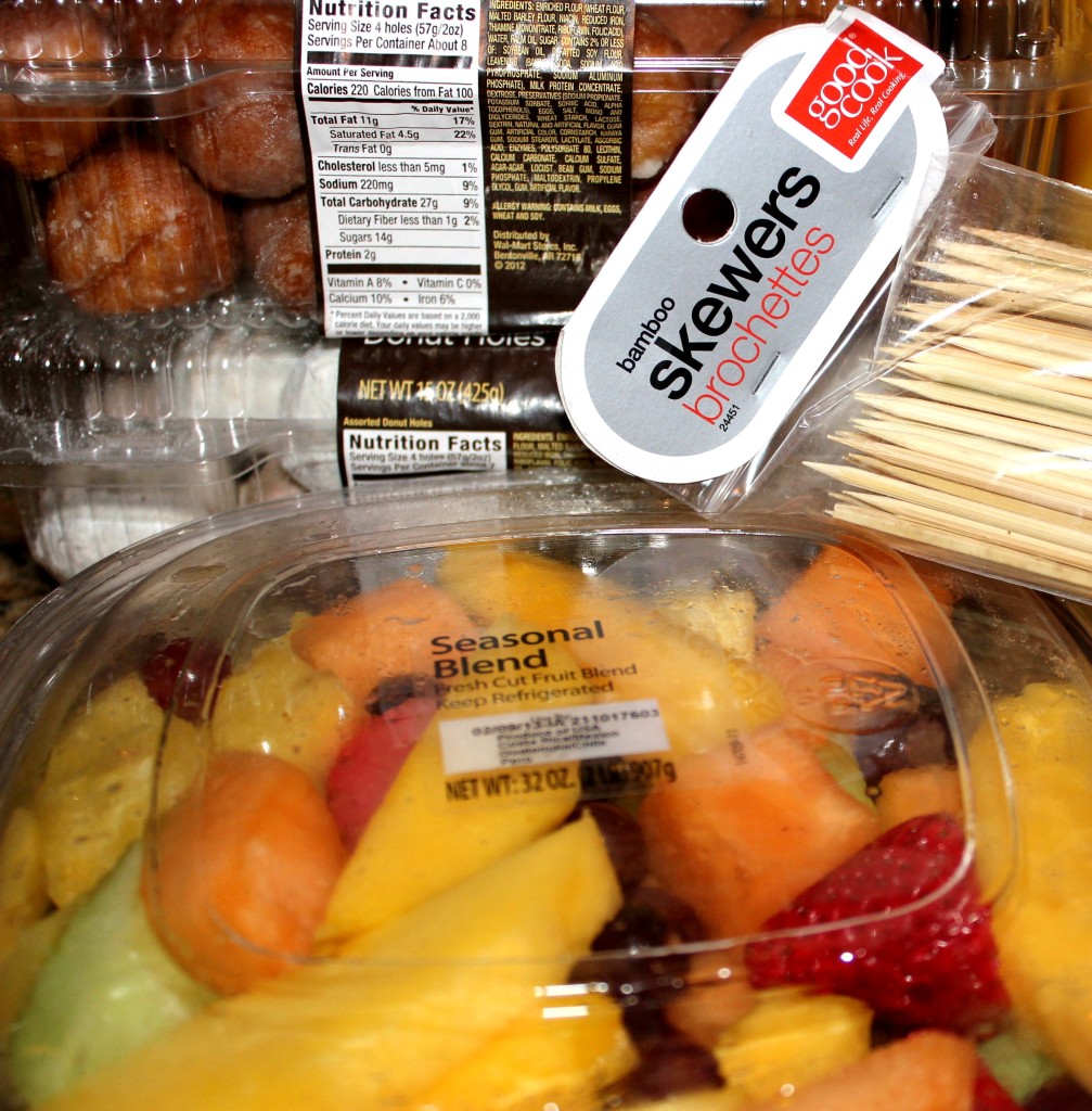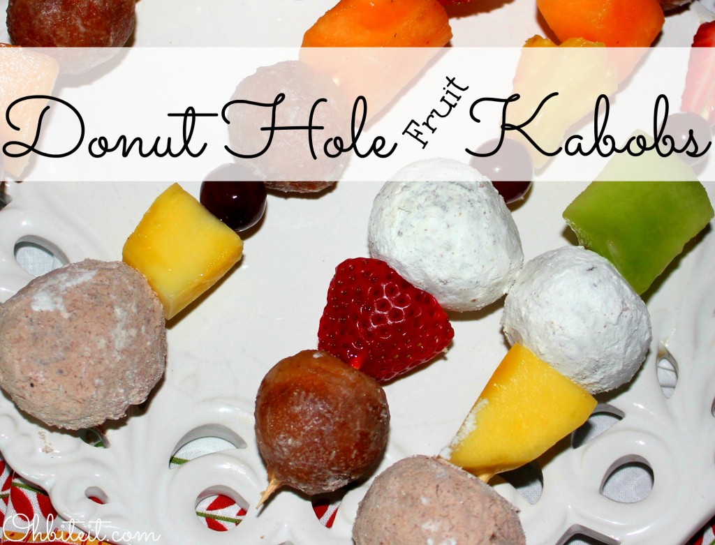 Simply assemble the skewers by altering like-sized fruit & the Donut Holes…