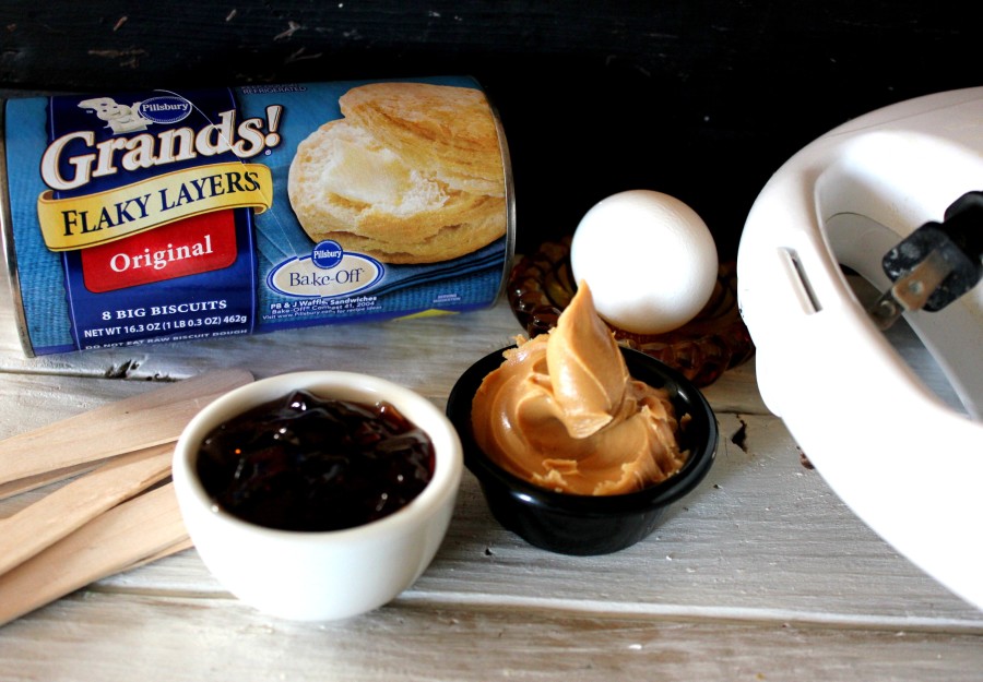 These Waffles don’t even require a Batter..nope! That’s right..no messy mixing or dirty bowls here, these are no muss-no fuss, since they’re made with Biscuit Dough. Yep..warm, flaky Biscuits magically morph into toasty, syrup filled “Waffles” that are stuffed with America’s favorite couple..”Peanut Butter & Jelly”! 🙂