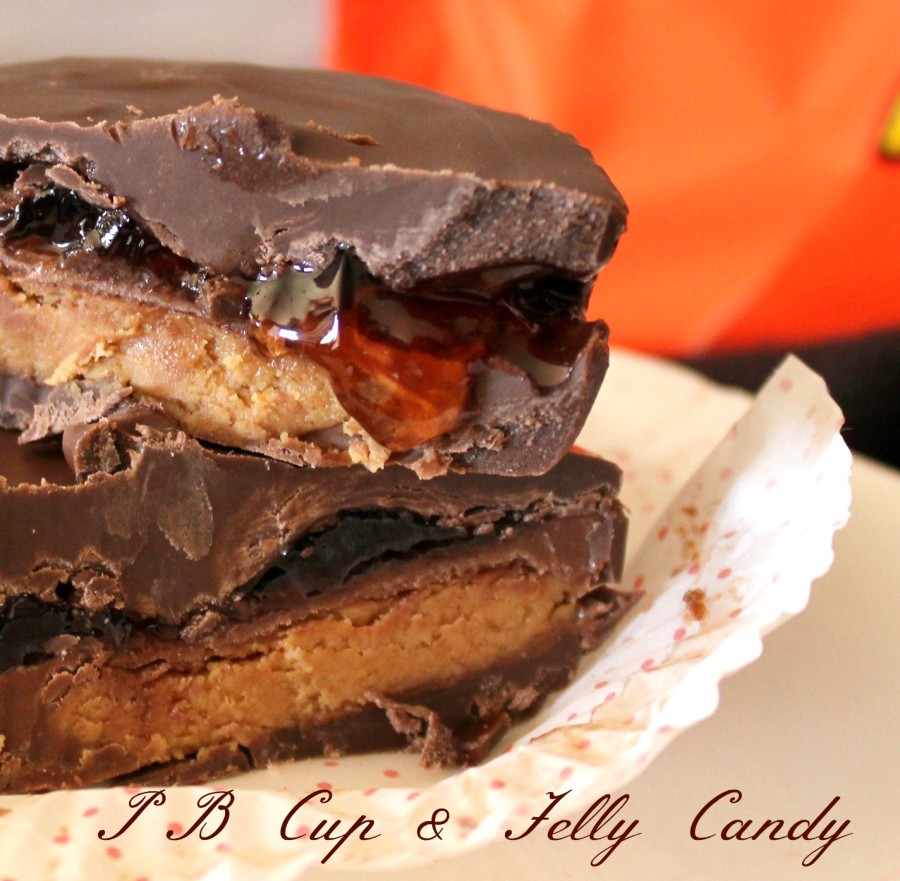 Pour a tbsp. of the melted Chocolate into a cupcake paper lined tin, and place a Reese’s Peanut Butter cup onto it. Top it with a 1/2 teaspoon of Jelly, and then the other tbsp. of melted Chocolate…