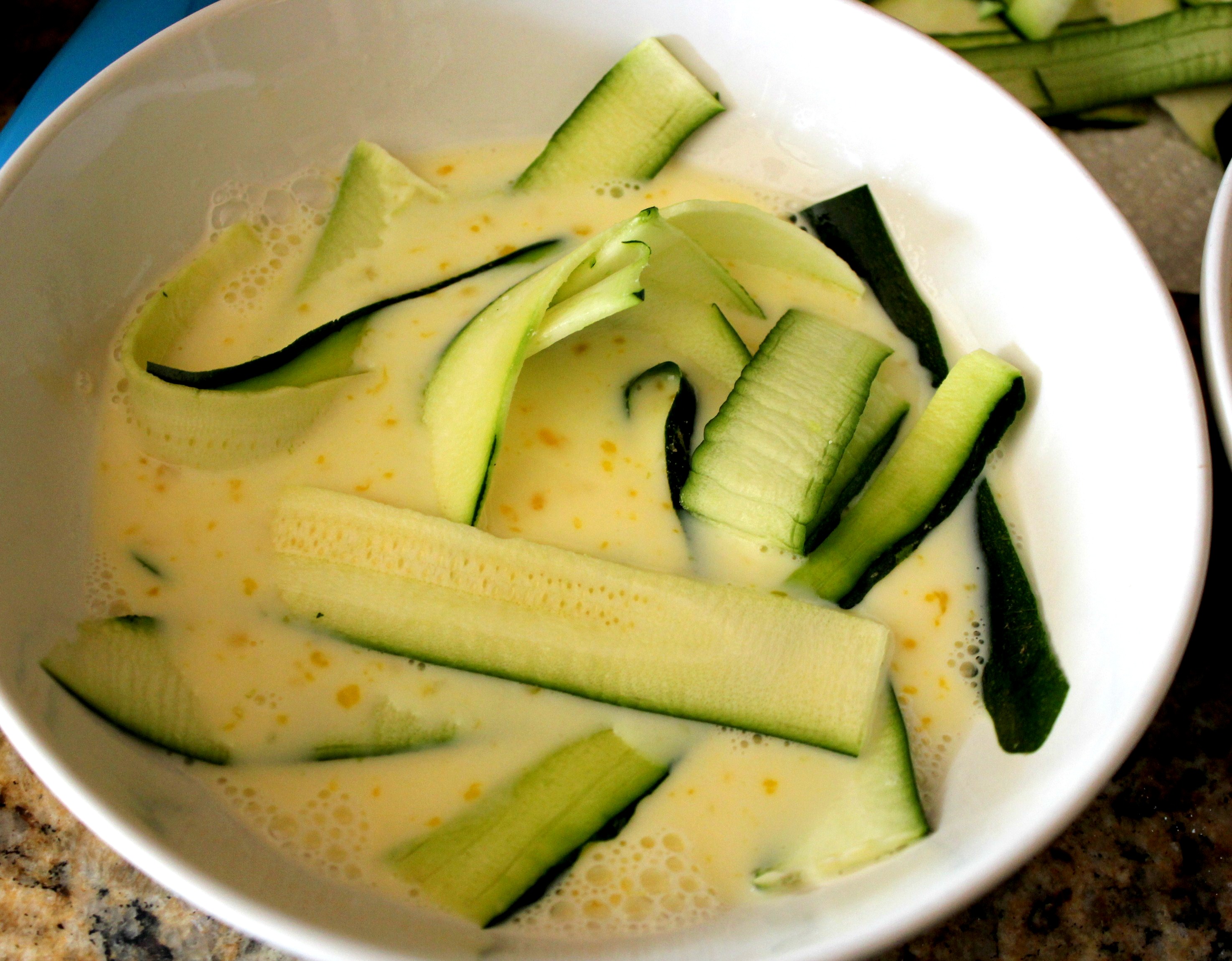 Prepare the breading in a medium bowl by combining the Panko, Bread Crumbs, and Parmesan. Take the wet Zucchini and add it in batches into the Crumbs, making sure to coat them very well…