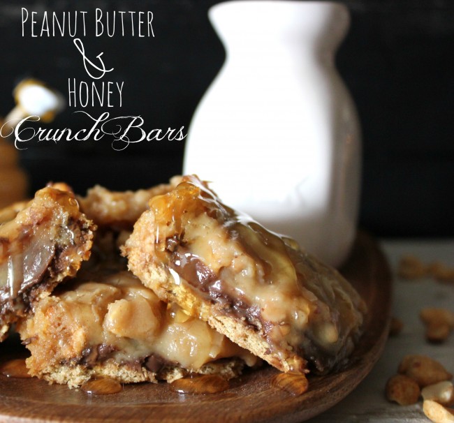This perfect pair just begged to be immortalized in a tasty Bar. And not just any Bar! I’m talking about a Graham Cracker Crusted, Toffee filled, Chocolate layered, sticky Honey’d, Peanut Buttery Bar! <THAT kind of Bar!
