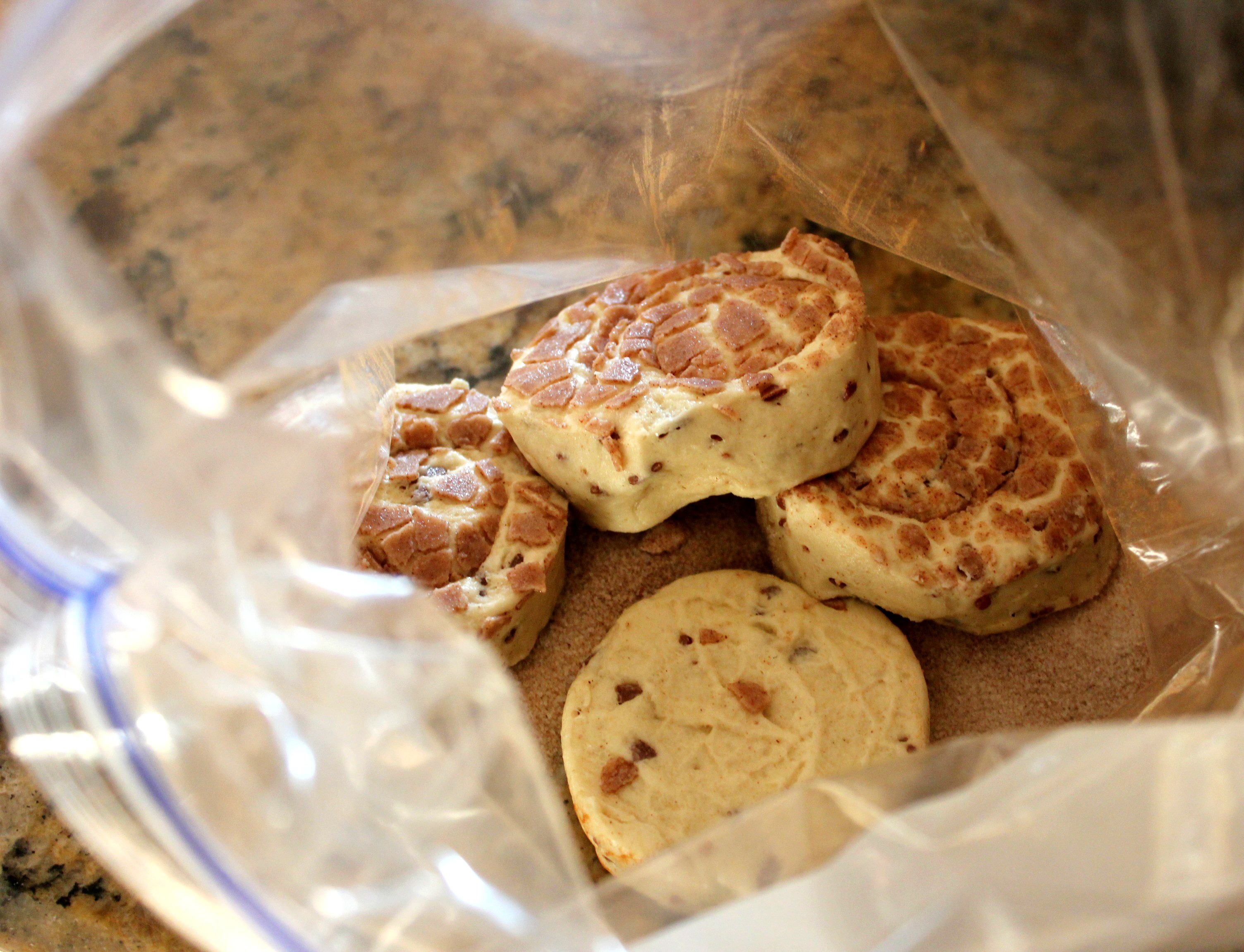 In a large Zipper Bag mix the granulated Sugar and the Cinnamon. Separate the Cinnamon Rolls and toss them in the bag a few at a time…