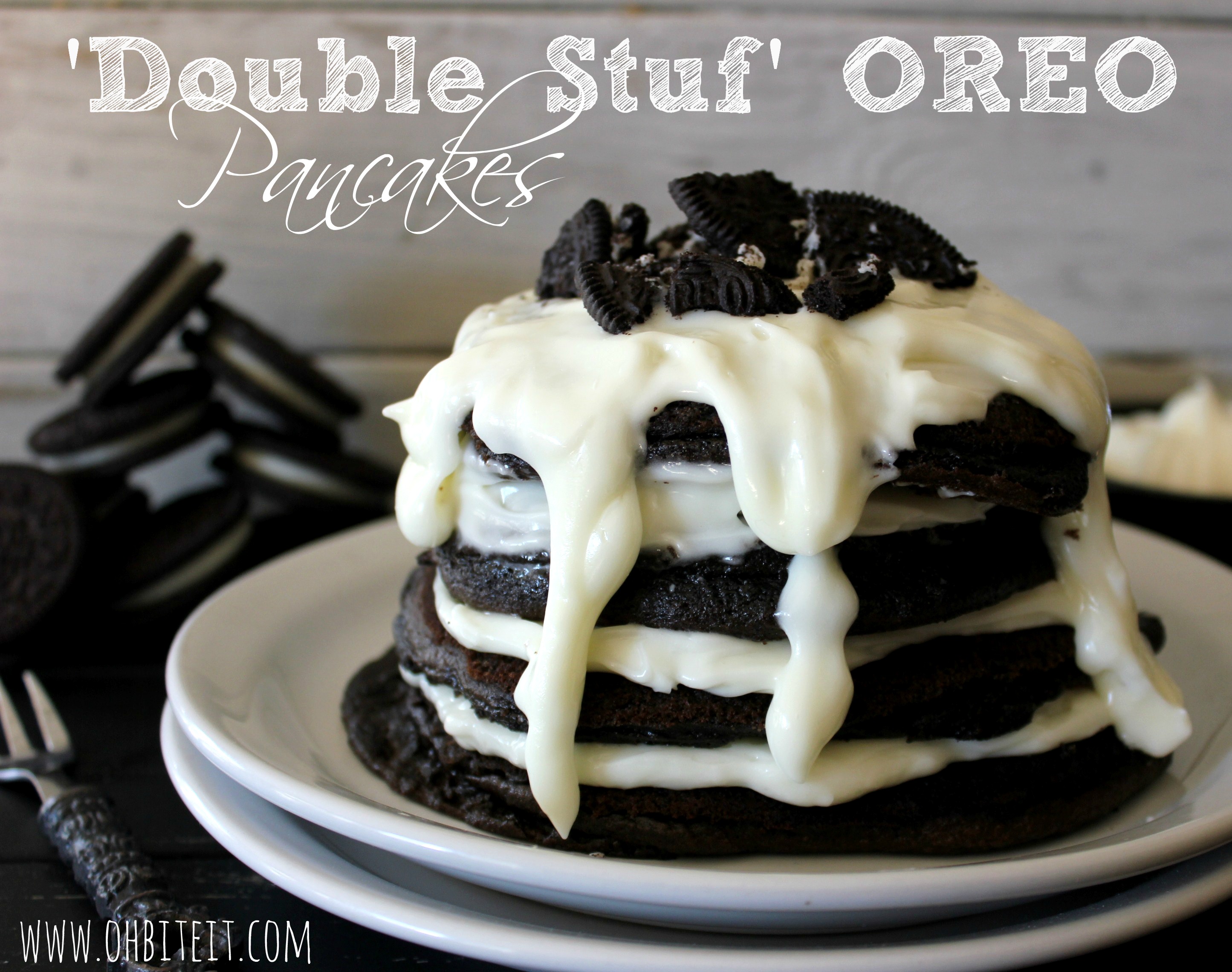 Fluffy, OREO filled cakes, are layered with creamy, Cheesecake-like ‘double stuf’ cream, that balances out the sweetness like perfection!! ~~They’re seriously like sinking your teeth into a warm stack of Double Stuf OREOS Cheesecake Pancakes!