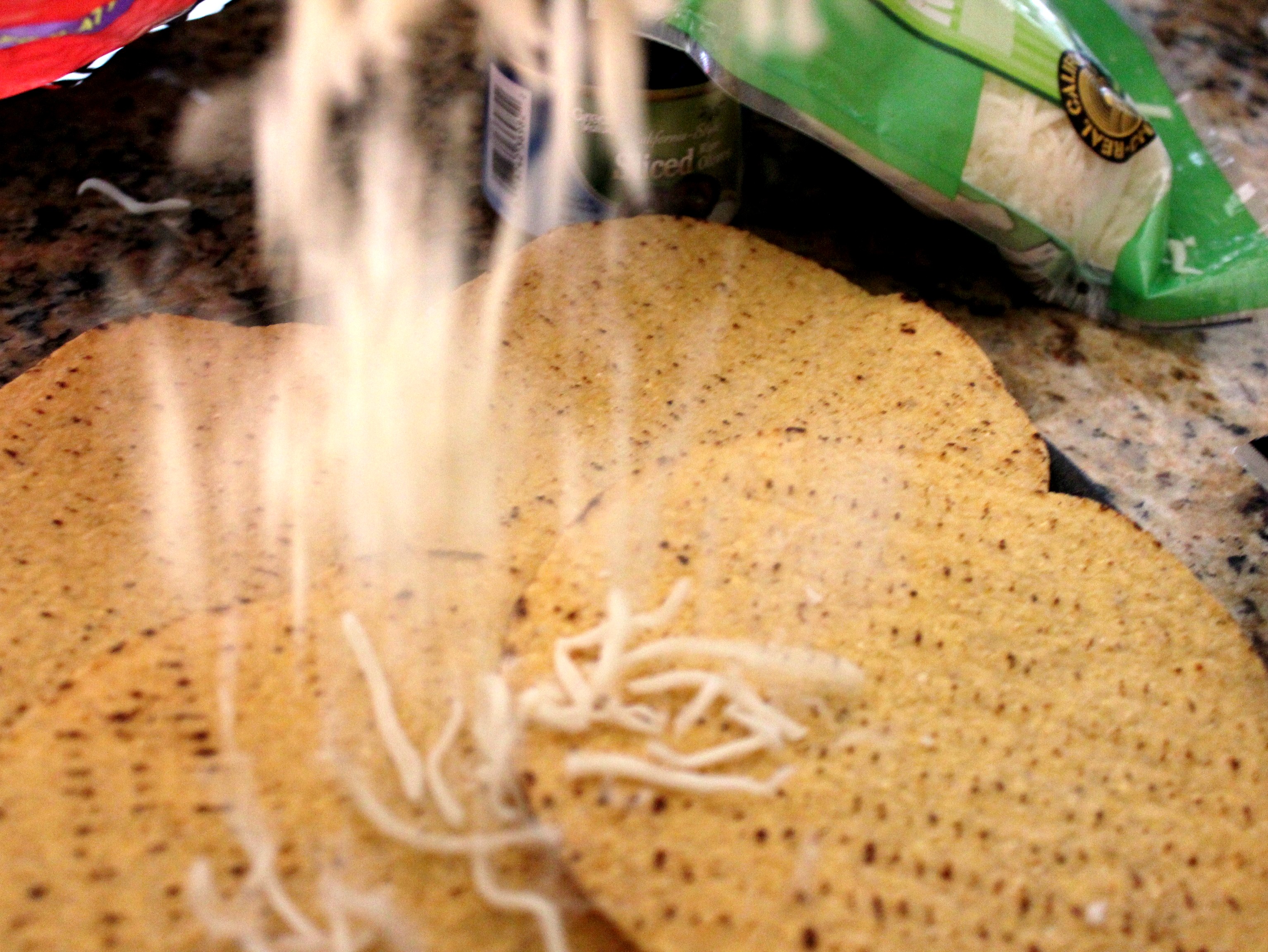 Start with a layer of Tostadas or Chips and lay on the Cheese…