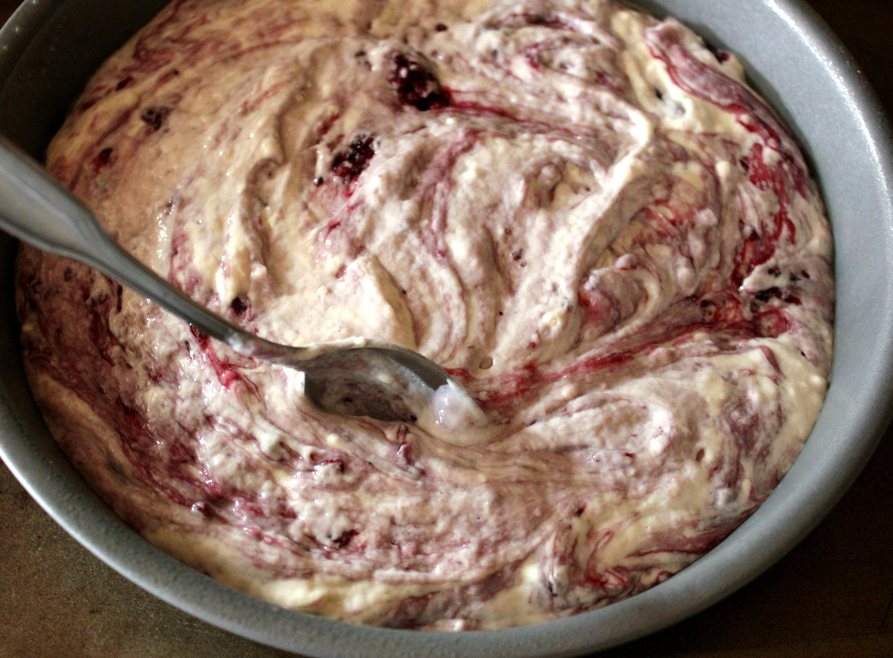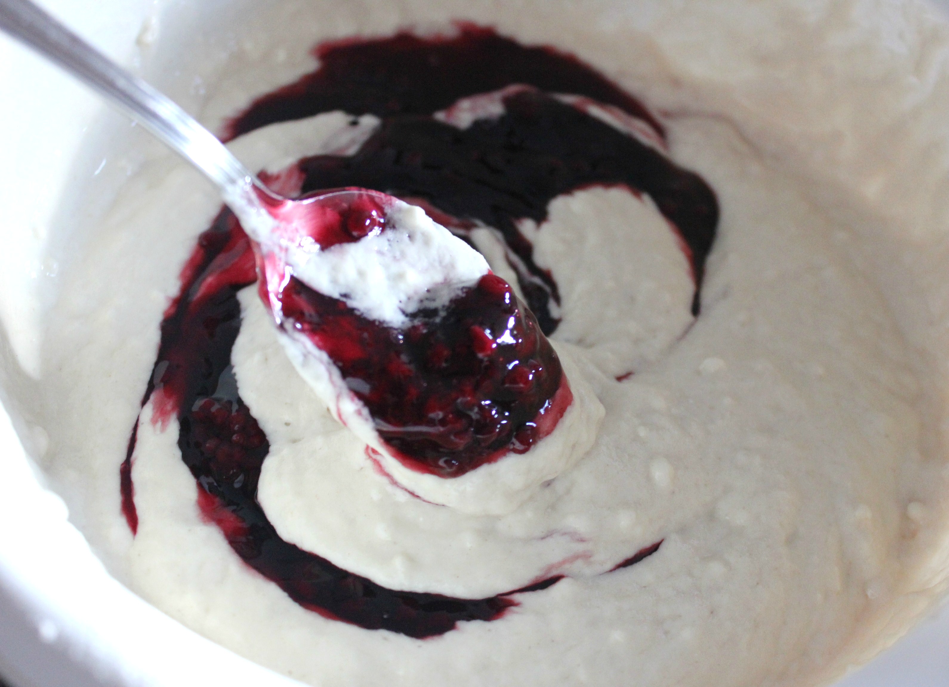 I could think of a million variations on this that would work. Today I had a package of Marie Callender’s premium biscuit mix which made 2 cups of batter if you make it up using the pancake version on their package. Added the Lucky Brand blackberry fruit to the mix. It turns out so moist and yummy!