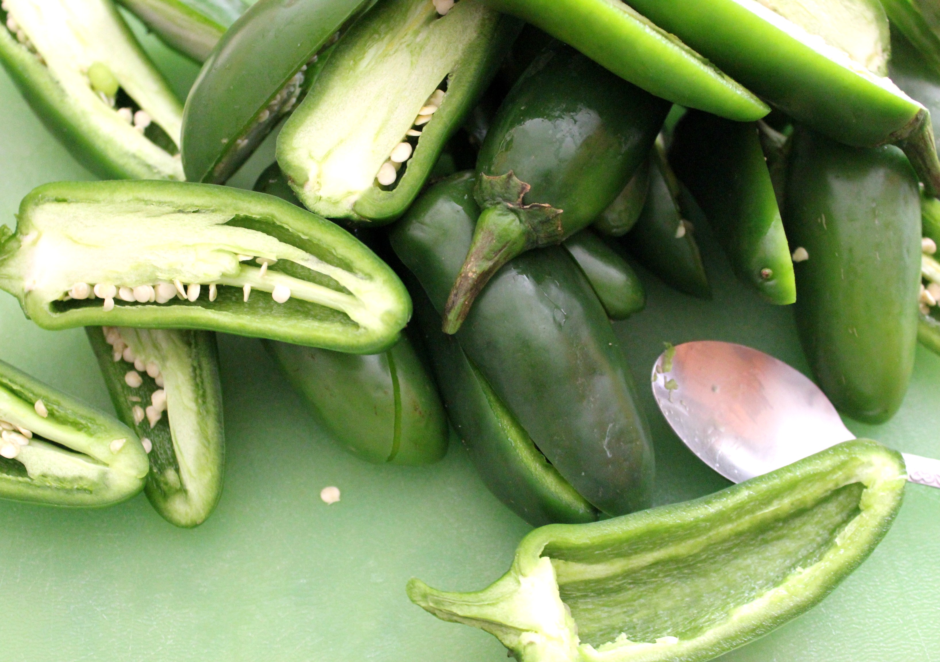 CAREFULLY (they’re SPICY)~ split and seed the Jalapenos, set them aside…