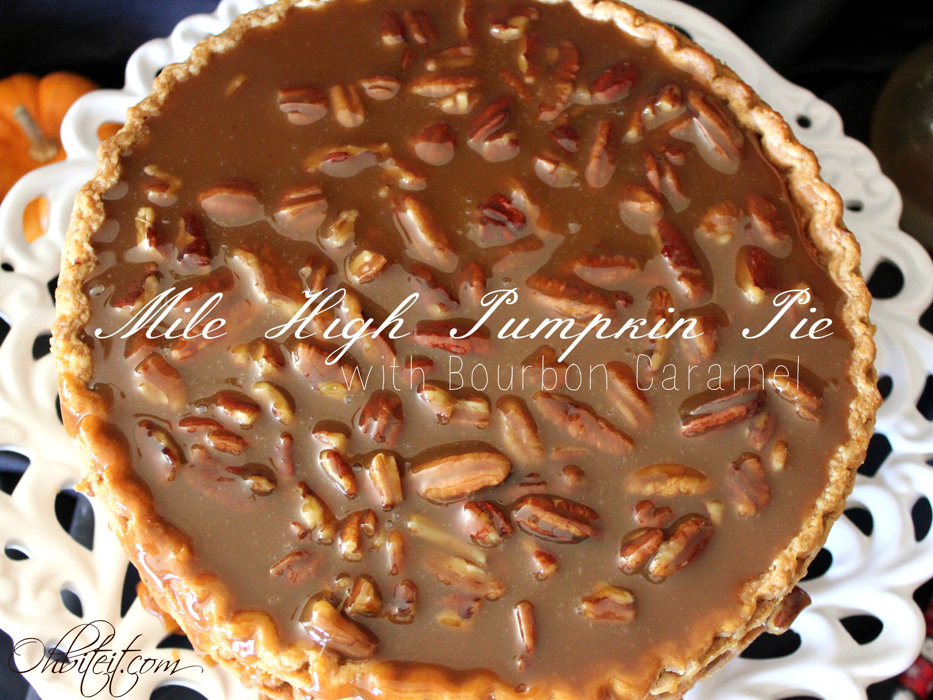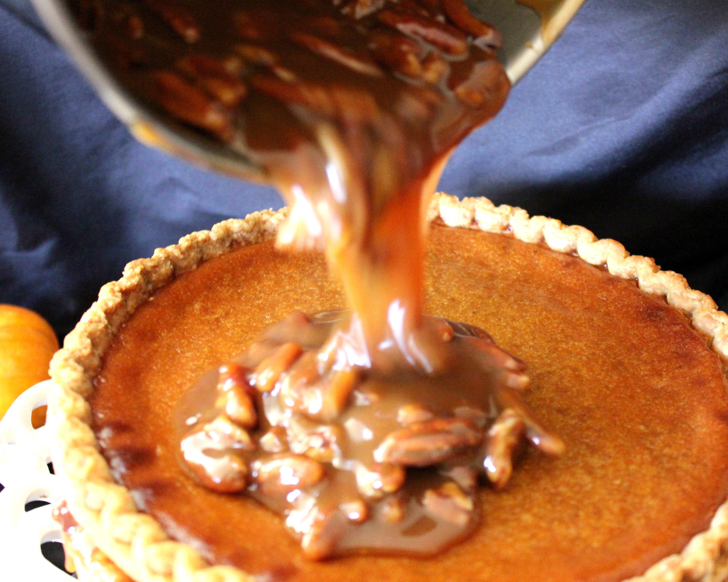 Pour some of it onto one of the Pies, top it with the other Pumpkin Pie and pour the rest of the Bourbon Caramel onto the top of it….