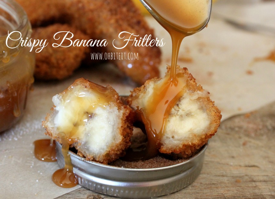 SOooo, I battered and fried theses sweet sticks of Cinnamony, Crispy, Banana Heaven and then plunged them deep into a thick pool of Caramel~ When you crunch through the crispy, toasty shell, and sink down into that sweet, warm, tender Banana you’ll be hooked!