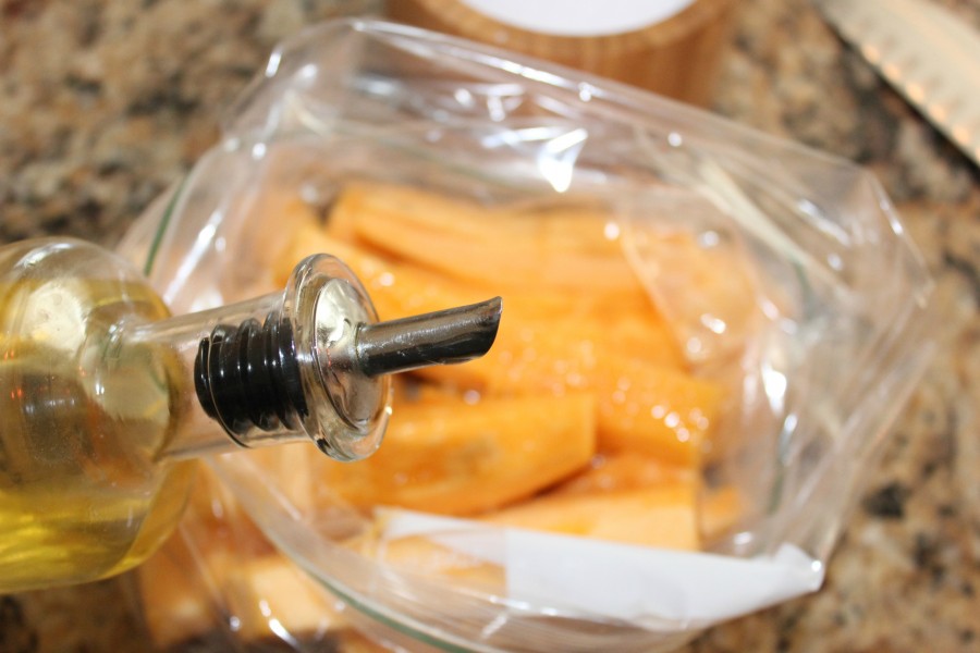 Place all of the fries into a large zip bag and pour in the oil…