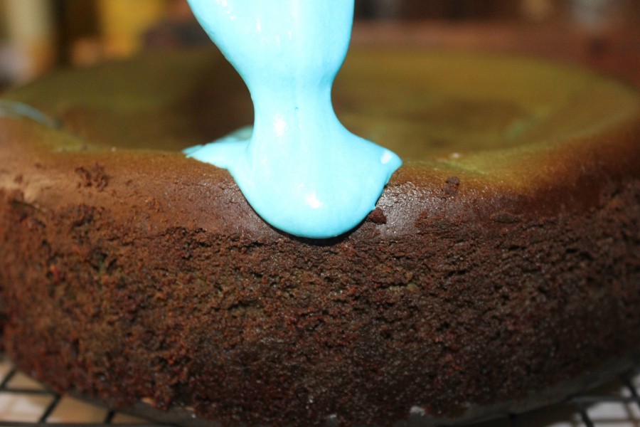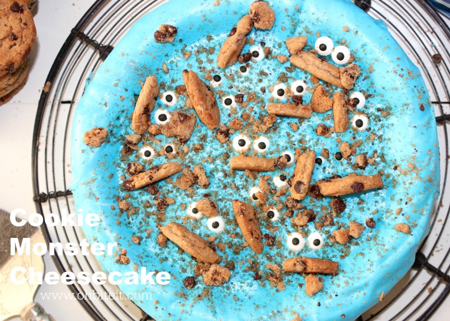 Now, remove the cheesecake from the pan and slightly warm up the frosting, and stir in more blue food coloring until it’s the proper “cookie monster blue” that makes you happy. 🙂
