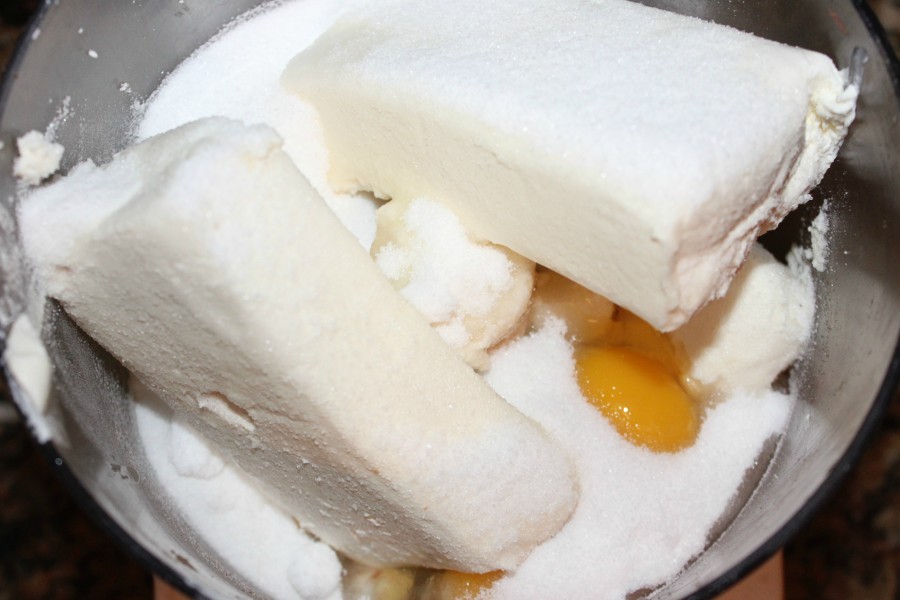 Wipe out the bowl and proceed to blend together the cheesecake filling, add the cream cheese, vanilla, eggs, and sugar…pulse until combined..