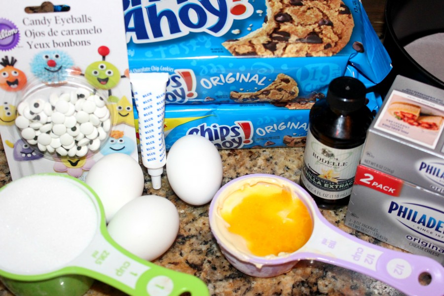 First, the buttery layer of Chocolate Chip Cookie Crust is to die for and makes the absolute perfect foundation for the beautiful blue billows of cheesecake and um..eyeballs. 😉