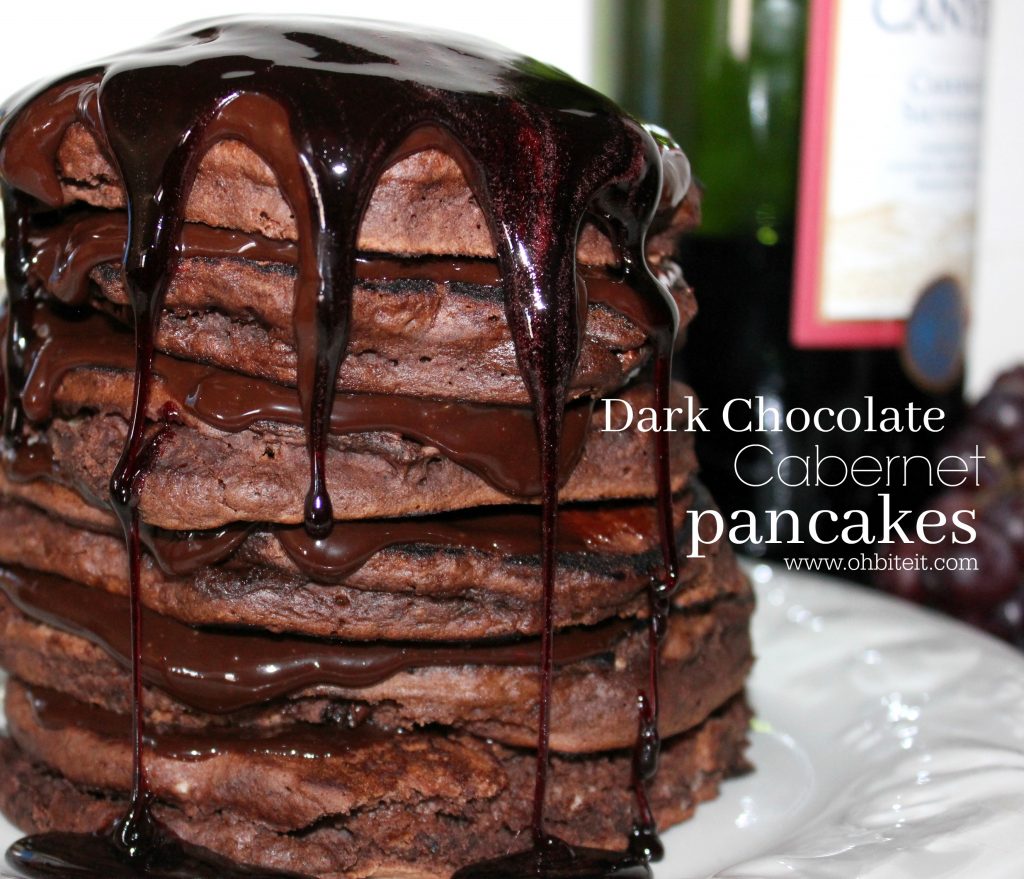 The buttermilk pancake batter is infused with dark chocolate cake, studded with chocolate chips, cooked to perfection and piled high between layers of smooth and creamy fudge. THEN..they’re decadently dripping in the BEST tasting Cabernet Syrup you can imagine. These are so savory, so sweet, and so deliciously unique that they’re perfect for a special occasion, or a late night breakfast-for-dinner-in-bed treat.