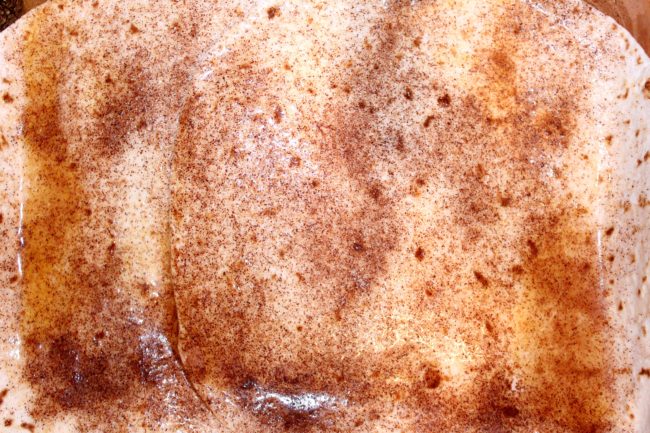 Top the last tortilla with some of the cinnamon butter, COVER it with foil, and bake it at 350 degrees for 20 minutes…