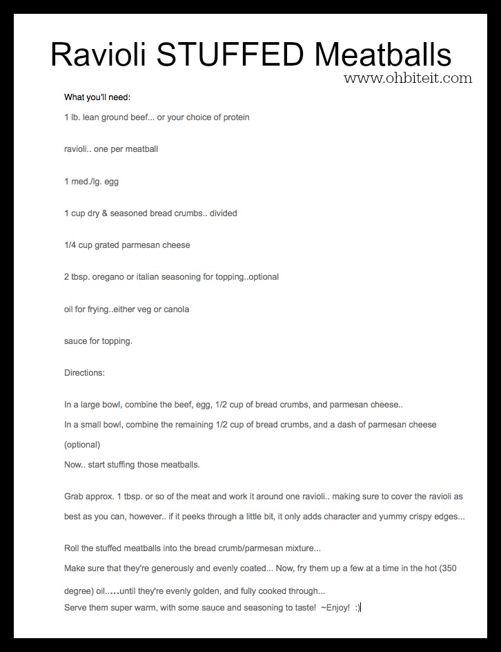 Each seasoned meatball is tender, and adorable, as they proudly show off their insides. This has got to be one of the easiest, yet most unique and delicious recipes to date! And YES, you can use turkey, chicken, even vegan options for the meatballs and even for the ravioli..the possibilities are endlessly scrumptious! ~Make LOTS!