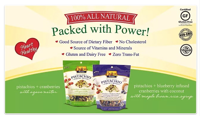 “Pistachio Chewy Bites were created with one simple concept in mind: make an all-natural snack that is both delicious and provides the nutritional fuel you need each day. By combining over 50% of our own California grown, nutrient rich pistachios with moist antioxidant cranberries, you get the energy and nutrients you need in one bite sized snack. As a bonus they are vegan, Kosher, Certified Gluten Free & Non-GMO Project Verified.