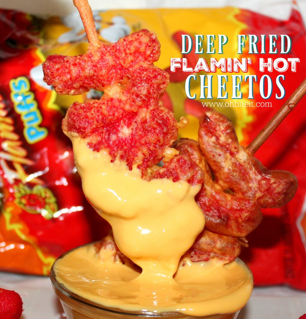 Yes..I’m talking about a sticked & stacked kabob of flamin’ hot cheetos, lightly battered and fried to an ungodly golden crisp.. all pushed over sanity’s edge with a deep plunge into some warm melted cheese, you know ~ just in case you weren’t self-hating enough yet. Ohh LAWD!