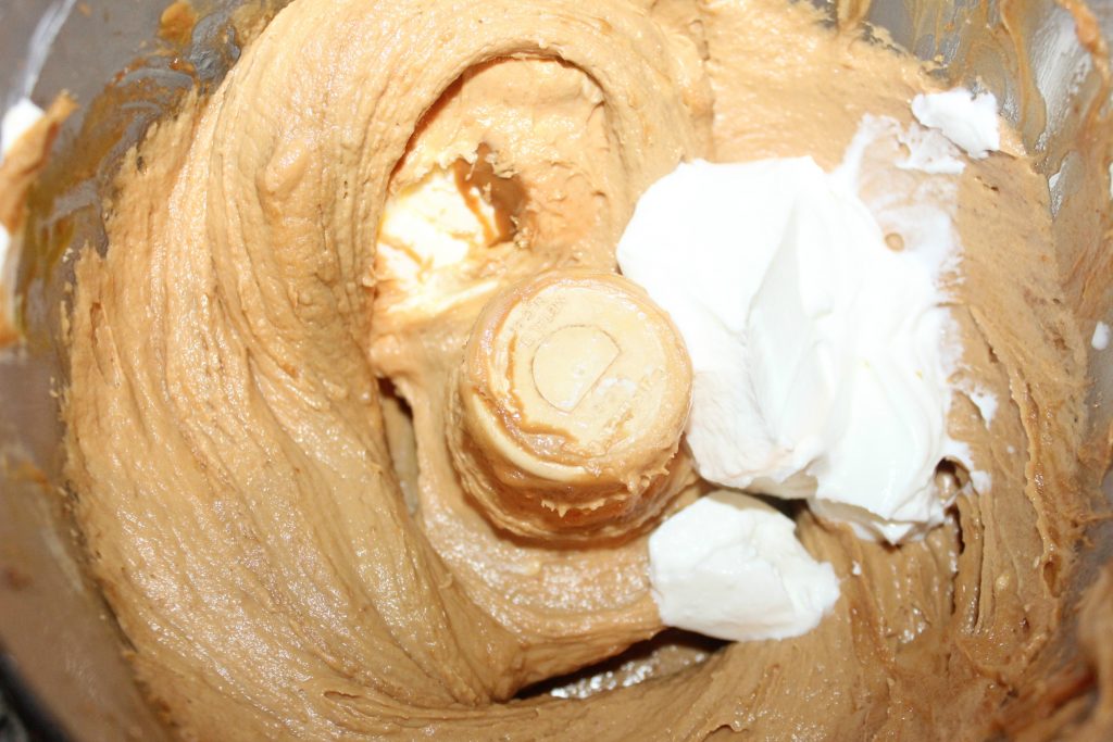 Now, into the food processor (no need to clean it), add in the jar of cookie butter, one block of cream cheese, one egg, mix until blended..