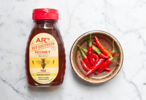 AR’s Hot Southern Honey is a honey produced in Virginia and infused with the mild and tasty heat of red chili peppers.