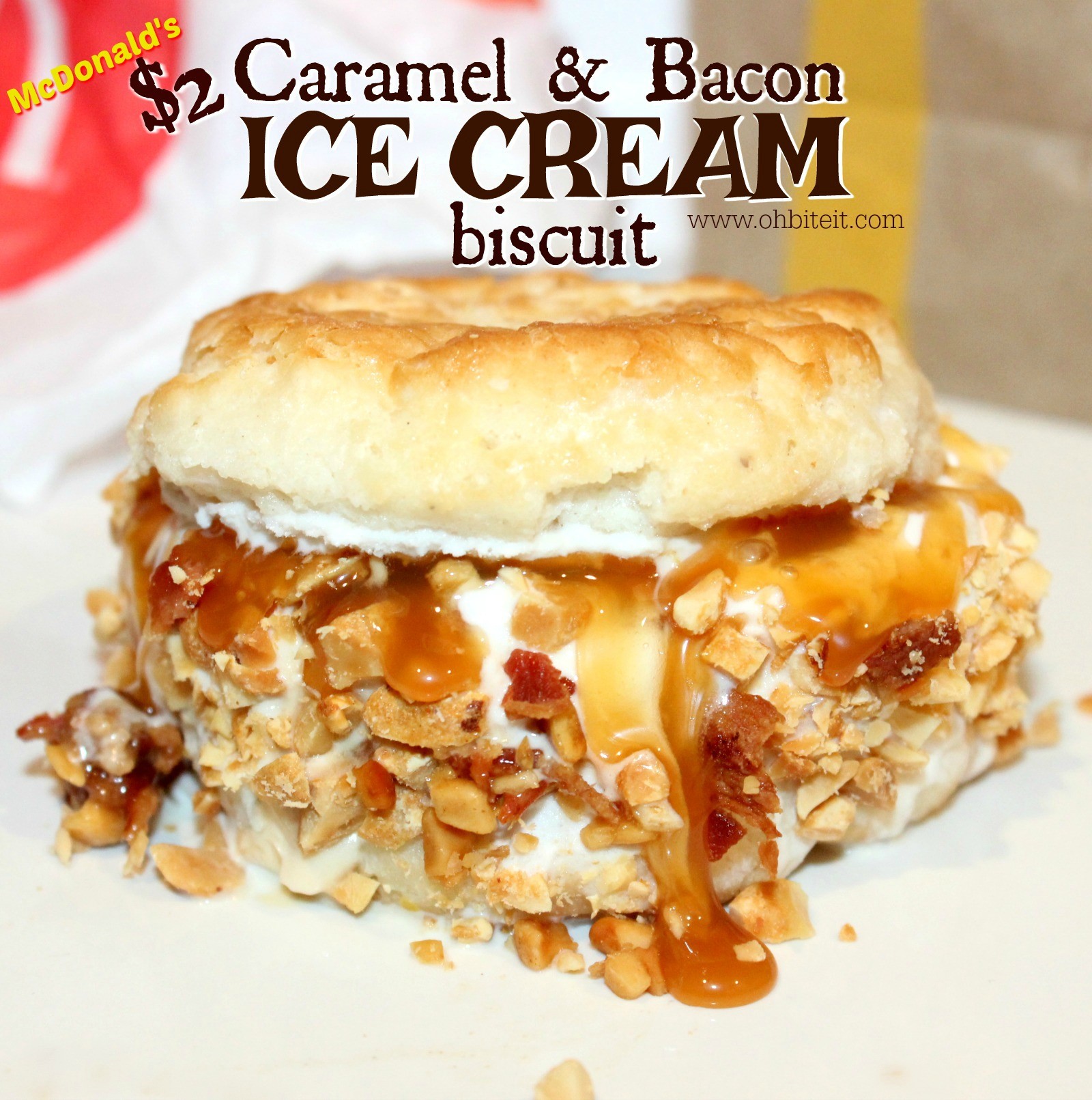 I present to you, a warm, fluffy, fresh, biscuit… filled (over-filled) with cold, creamy, caramel ice cream.. all rolled up in peanuts and yes — BACON! At your fingertips, for not much more than the sticky change in your vehicle’s cup holder. And YOU. ARE. WELCOME!