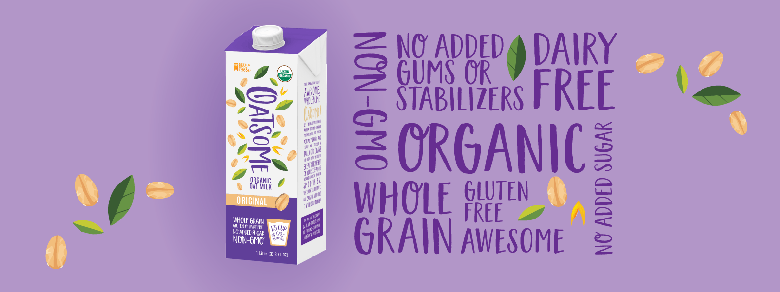 Oh hello there! We’re Oatsome oat milk from BetterBody Foods and we can’t wait for you to try our deliciously drinkable, fantastically frothable, non-dairy milk made from organic rolled oats. Oatsome delivers mild, creamy flavor – without dairy, nuts, added sugars, or anything artificial!