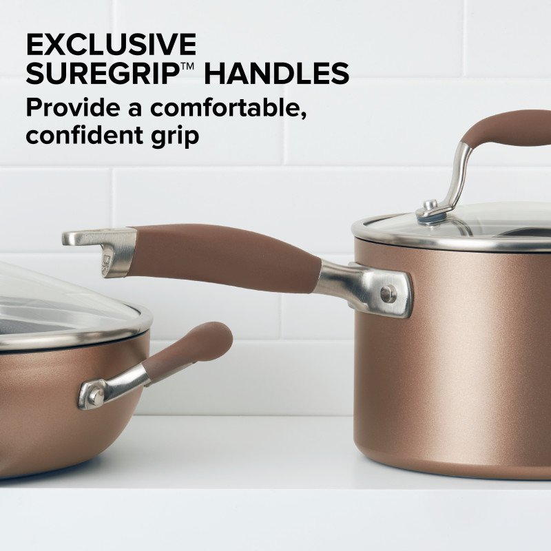 - The sauté’s Anolon SureGrip handles are designed for a comfortable grip, dual riveted for extra strength, and oven safe to 400 degrees F