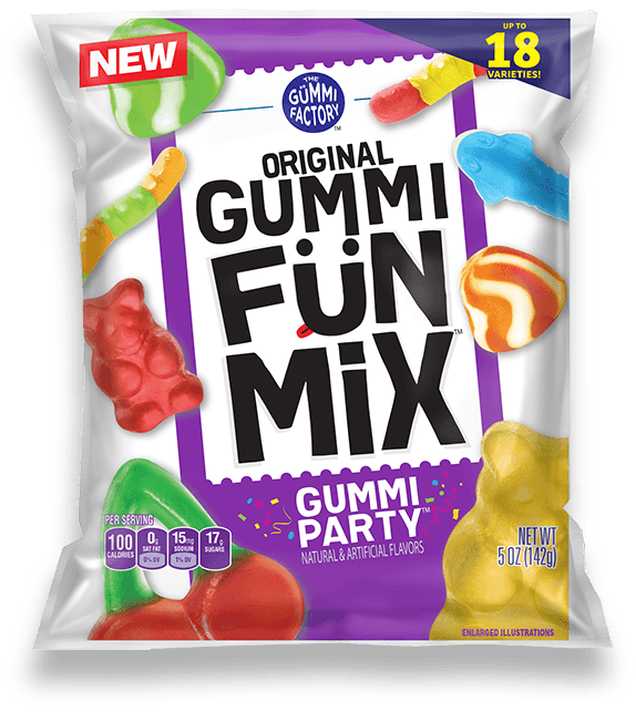 GUMMI PARTYTM combines 18 Gummi favorites including Gummi Cherries, Gummi Oranges n Cream and Strawberries n Cream Swirly Drops, along with Gummi Bears, Gummi Worms, Gummi Sharks and more!