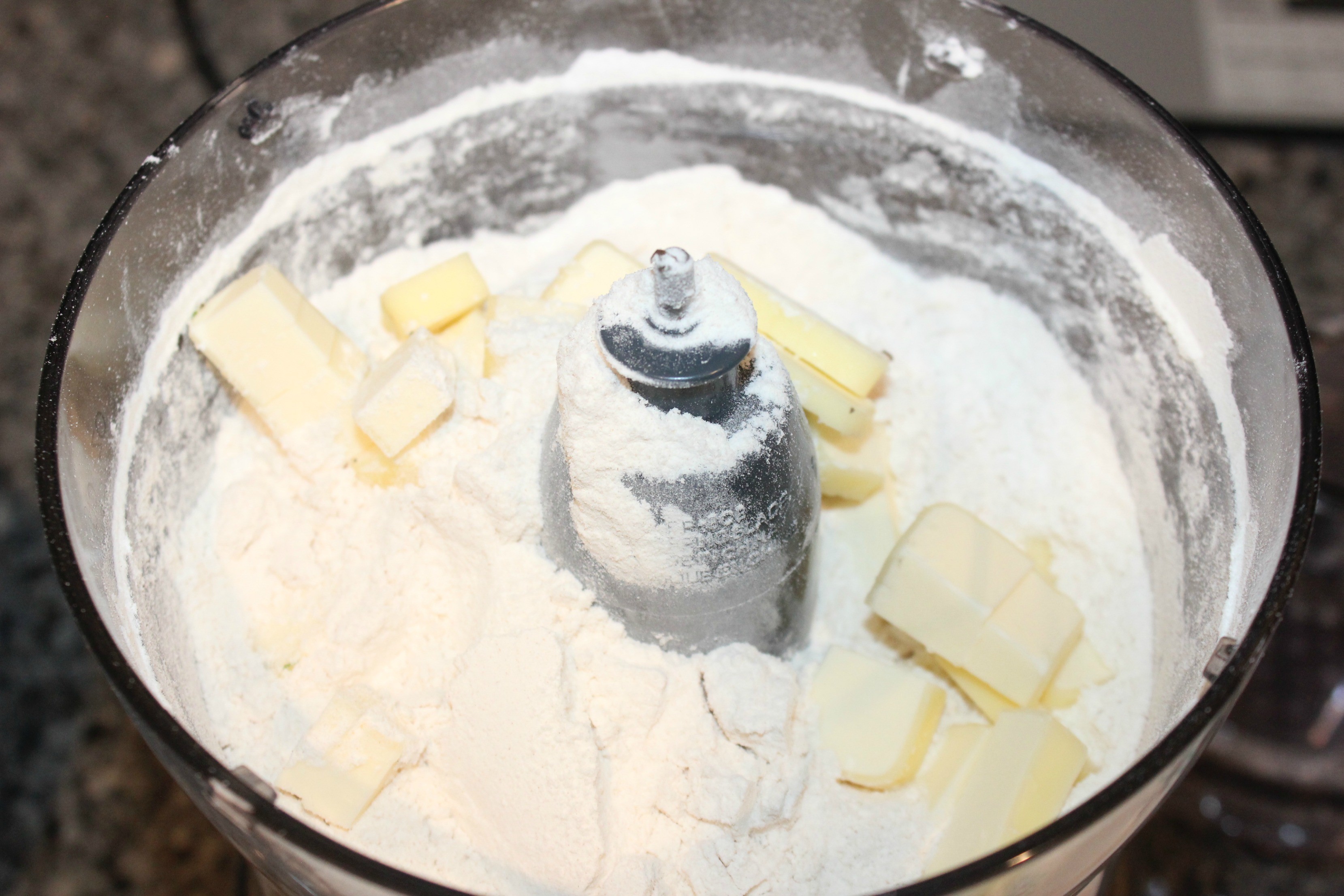 in a food processor, add the butter into the flour – pulse until it’s fully combined, and a sand-like consistency…