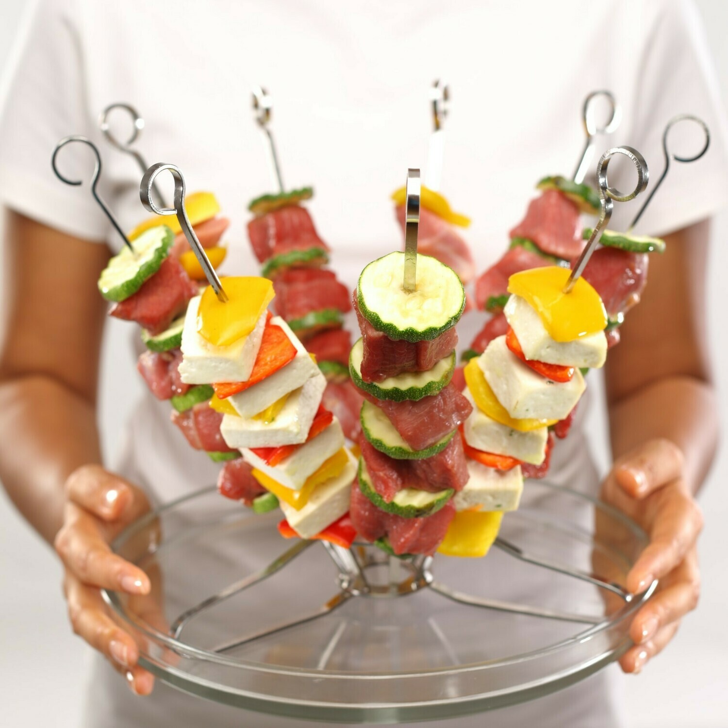 The O-Yaki Skewer System includes a stainless steel stand, nine skewers and a recipe booklet to make delicious Garlic Shrimp, Jamaican Jerk Chicken, French Brochettes and Roast Vegetables. You can even roast a whole chicken using the O-Yaki Skewer System. To learn more, visit https://www.o-yaki.com/ and Amazon.