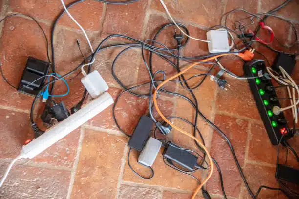 Photo of tangled wires and overloaded power boards